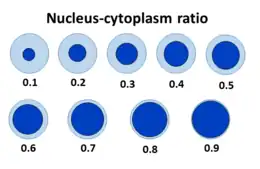 The nuclear–cytoplasmic ratio (also variously known as the nucleus:cytoplasm ratio, nucleus–cytoplasm ratio, N:C ratio, or N/C) is a measurement used in cell biology. It is a ratio of the size (i.e., volume) of the nucleus of a cell to the size of the cytoplasm of that cell.[1]