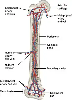 ![]() The blood supply to long bones, here with nutrient artery, vein and foramen labeled. | |