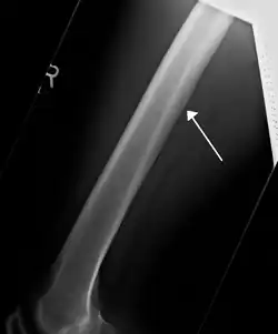 ![]() A nutrient canal feeding the femur seen on X-ray | |