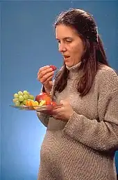 Pregnant women are advised to pay attention to the foods they eat during pregnancy in order to reduce the risk of exposure to substances or bacteria that may be harmful to the developing fetus. This can include potentially harmful pathogens such as listeria, toxoplasmosis, and salmonella.[7] Intake of large amounts of retinol has been linked to birth defects and abnormalities.[38]