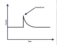 Another electrophysiological measurement that can be made is fusion event duration in a nystatin-ergosterol based system. Fusions are measured while the voltage is held constant, and is characterized by a spike in the current that then returns to the baseline current as the nystatin channels close. When present in smaller concentrations, nystatin momentarily forms pores that allows a vesicle fusion to occur more easily; that fusion then interrupts the pore stability and the nystatin and ergosterol disperse from each other.[31] Conversely, researchers have found that the half-life of these nystatin pores increase with an increased dosage level of nystatin to the membrane systems. This indicates a lower energy of both the lipid membrane and the ionophores when there is a higher concentration of nystatin.[32]
