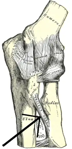 The oblique cord is a ligament between the ulnar and radius bones in the forearm near the elbow. It takes the form of a small, flattened band, extending distally and laterally, from the lateral side of the ulnar tuberosity at the base of the coronoid process to the radius a little below the radial tuberosity.[1] Its fibers run in the opposite direction to those of the Interosseous membrane of the forearm.[1]