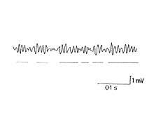 Ocular microtremor is smaller than the other fixational eye movements of microsaccades and drift.[1][3] It occurs between microsaccades, during the same time intervals as drift.[1][3] The measured frequency and amplitude of ocular tremor have been found to vary.[1][2][3] The frequency typically falls between 30 Hz and 103 Hz, while the amplitude has been measured to be approximately four thousandths of a degree.[3][1][2]