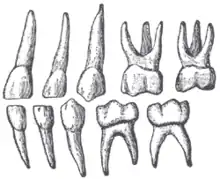 Several studies have established that on average males have larger teeth than females, although the differences are small and not always statistically significant.[6][7][8] The most sexually dimorphic human teeth are the canines, with other teeth showing smaller size differences.[9][10] Recent research looking at the dental tissues within the tooth crown indicate that male teeth have significantly greater quantities of dentine than females, both absolutely and proportionally, and such differences could be useful in estimating sex.[11][12]