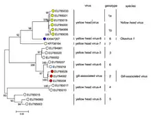 Okavirus is a genus of enveloped positive-strand RNA viruses which infect crustaceans.[1] Host organisms are mostly shrimp. It is the only genus in the family Roniviridae.[2] Viruses associated with the genus include: gill-associated virus (GAV) which causes reddening, biofouling with exoparasites, emaciation, and massive mortality; and yellow head virus (YHV) which causes yellow head, arrest of feeding, and massive mortality.[1][3] The name is derived from the 'Oka' or lymphoid organ in which the viruses are commonly detected and in which pathology occurs during acute infections. Lymphoid organs are anatomical structures common to penaeid shrimp. There are three species in this genus.[1]