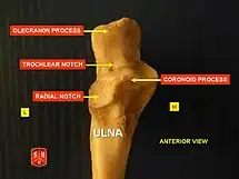 It is bent forward at the summit so as to present a prominent lip which is received into the olecranon fossa of the humerus during extension of the forearm.[2][3]