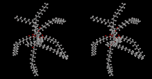 ![]() Top: Generic 2D structure of olestra, where R = H or fatty acid group, C(O)CnHm Bottom: Stereoscopic animation of a representative olestra molecule with 8 unsaturated fatty acid groups | |
