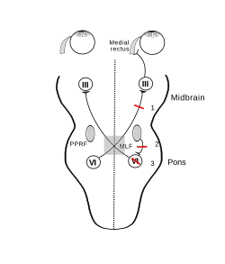 - ↑ Wall M, Wray S (1983). "The one-and-a-half syndrome--a unilateral disorder of the pontine tegmentum: a study of 20 cases and review of the literature". Neurology. 33 (8): 971–80. doi:10.1212/wnl.33.8.971. PMID 6683820. S2CID 35636994.