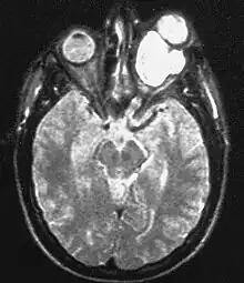 | Magnetic resonance image of a large retrobulbar optic nerve tumor causing massive proptosis | |