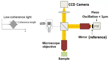 More precisely, interferometric images are created by a Michelson interferometer where the path length difference is varied by a fast electric component (usually a piezo mirror in the reference arm). These images acquired by a CCD camera are combined in post-treatment (or online) by the phase shift interferometry method, where usually 2 or 4 images per modulation period are acquired, depending on the algorithm used.[69][70] More recently, approaches that allow rapid single-shot imaging were developed to simultaneously capture multiple phase-shifted images required for reconstruction, using single camera.[71] Single-shot time-domain OCM is limited only by the camera frame rate and available illumination.