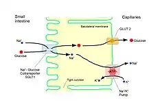 Sodium absorption occurs in two stages. The first is via intestinal epithelial cells (enterocytes). Sodium passes into these cells by co-transport with glucose, via the SGLT1 protein. From the intestinal epithelial cells, sodium is pumped by active transport via the sodium-potassium pump through the basolateral cell membrane into the extracellular space.[41][42]
