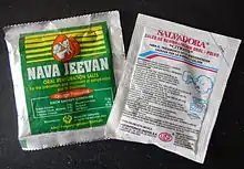 Commercially available oral rehydration salts: left, from Nepal; right, from Peru.