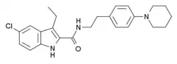 Org 27569 is a drug which acts as a potent and selective negative allosteric modulator of the cannabinoid CB1 receptor. Studies in vitro suggest that it binds to a regulatory site on the CB1 receptor target, causing a conformational change that increases the binding affinity of CB1 agonists such as CP 55,940, while decreasing the binding affinity of CB1 antagonists or inverse agonists such as rimonabant. However while Org 27569 increases the ability of CB1 agonists to bind to the receptor, it decreases their efficacy at stimulating second messenger signalling once bound, and so in practice behaves as an insurmountable antagonist of CB1 receptor function.[1]