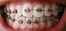 An archwire in orthodontics is a wire conforming to the alveolar or dental arch that can be used with dental braces as a source of force in correcting irregularities in the position of the teeth. An archwire can also be used to maintain existing dental positions; in this case it has a retentive purpose.[1]