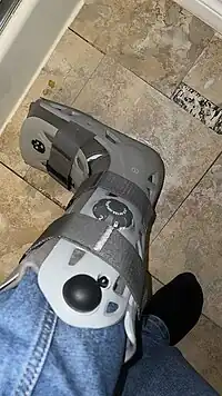 A controlled ankle motion walking boot, also referred to as a controlled ankle movement walking boot, below knee walking boot, CAM boot, CAM walker, or moon boot, is an orthopedic device prescribed for the treatment and stabilization of severe sprains,[3] fractures, and tendon or ligament tears in the ankle or foot. In situations where ankle motion but not weight is to be limited, it may be used in place of a cast.[4]