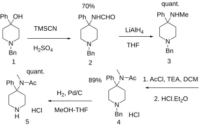 The reaction of 1-Benzyl-4-phenyl-4-piperidinol [63843-83-4] (1) with trimethylsilyl cyanide and subsequent Ritter reaction gave N-(1-Benzyl-4-phenylpiperidin-4-yl)formamide, CID:10979305 (2). The reduction of the formamide with lithium aluminium hydride gave 1-benzyl-N-methyl-4-phenylpiperidin-4-amine [172734-03-1] (3). Reaction with acetic anhydride gave CID:22741820 (4). Catalytic hydrogenation removal of the benzyl protecting group gave N-Methyl-N-(4-phenylpiperidin-4-yl)acetamide [172733-87-8] (5).