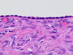 ![]() Histology of ovarian surface epithelium. H&E stain. The epithelium is the chain-like covering with round dark blue nuclei at top. | |
