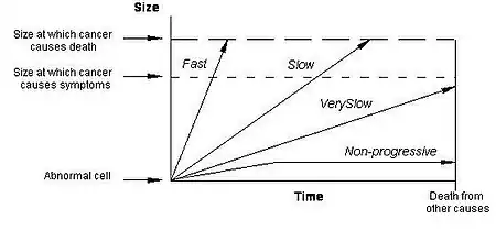 The arrow labeled "Non-progressive" represents a cancer that never causes problems because it is not growing at all. In other words, there are cellular abnormalities that meet the pathologic definition of cancer but never grow to cause symptoms—alternatively, they may grow and then regress. Although the concept of non-progressive cancers may seem implausible, basic scientists have begun to uncover biologic mechanisms that halt the progression of cancer.[3][4][5] Some cancers outgrow their blood supply (and are starved), others are recognized by the host's immune system (and are successfully contained), and some are not that aggressive in the first place.