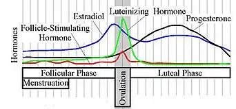 Ovulatory cycle shifts are hypothesized to be regulated by sex hormones, primarily estradiol and progesterone, which become elevated at different times across the cycle. In particular, high levels of estradiol and low levels of progesterone, which peak at high fertility just prior to ovulation, have been shown to be correlated with several mating-related psychological changes.[23][24] However, some studies have only found correlations with changes in estradiol.[25][26] It is well-established that estradiol can act in the brain to produce other psychological and behavioral changes,[27] and animal studies tend to show a link between sexual behavior and estrogen concentrations.[28] Other hormones such as testosterone, follicle-stimulating hormone (FSH), luteinizing hormone (LH), and prolactin have been studied as possible correlates, but most have produced little to no effect.[25]