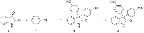 In 1885, it was reported that condensation of isatin with phenol 2 leads to oxyphenisatin (3), which can then also be acetylated to (4).