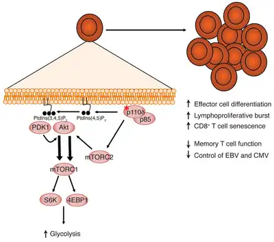 P110δ contains at least five domains (figure 1): adaptor-binding domain, a Ras GTPase-binding domain, a PI(3)K-type C2 domain, helical domain, and a kinase domain.[1] Mutations have been identified in multiple domains,[1] although there seems to be a recurrent transition mutation (G>A causing E1021K) in the C lobe of the kinase domain,[1][2] leading to constitutive activation of enzyme function. Specific p110δ mutants cause stronger binding to membranes and relieve inhibition of the kinase by regulatory proteins.[1][2] These changes appear to affect the immune system through over activating the downstream mTOR pathway.[1]