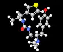 PZM21 is an experimental opioid analgesic drug that is being researched for the treatment of pain.[1] It is claimed to be a functionally selective μ-opioid receptor agonist which produces μ-opioid receptor mediated G protein signaling, with potency and efficacy similar to morphine, but with less β-arrestin 2 recruitment.[2] However, recent reports highlight that this might be due to its low intrinsic efficacy,[3] rather than functional selectivity or 'G protein bias' as initially reported. In tests on mice, PZM21 was slightly less potent than morphine or TRV130 as an analgesic, but also had significantly reduced adverse effects, with less constipation than morphine, and very little respiratory depression, even at high doses.[4] This research was described as a compelling example of how modern high-throughput screening techniques can be used to discover new chemotypes with specific activity profiles, even at targets such as the μ-opioid receptor which have already been thoroughly investigated.[5] More recent research has suggested however that at higher doses, PZM21 is capable of producing classic opioid side effects such as respiratory depression and development of tolerance and may have only limited functional selectivity.[6]