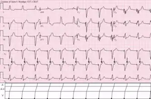 | Ventricular pacemaker with 1:1 retrograde ventriculoatrial (V-A) conduction to the atria (arrows). | |