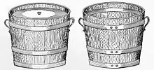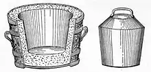 Some pails were supplied with deodorants such as iron sulphate. Manchester Corporation attempted to remove the smell of putrefaction by attaching cinder-sifters to their closets so that fine ash could be poured on top of the excrement.[16] The Goux system, invented in the 1860s by Pierre Nicholas Goux, a landowner near Paris, and widely used in France, overcame some of the more common problems associated with pail closets by lining the pail with an absorbent material.[1] The Rochdale Corporation experimented with Goux's design for several months but settled instead on a system which used smaller pails. Goux's system did, however, find a home in Halifax, where it was used in more than 3,000 closets after 1870. The wooden pails used in Halifax were oval in cross-section (about 24 by 19 inches) and 16 inches deep. Each was lined at the sides and bottom with a mixture of refuse, such as straw, grass, street sweepings, wool, hair, and even seaweed. This lining, which was formed by a special mould and to which sulphate of lime was added, was designed to help remove the smell of urine, slow putrefaction and keep the excreta dry. Pails were collected between 7 am and 5:30 pm. Members of the public occasionally complained about the smell, which usually occurred when a pail was left to overflow, such as in winter 1875 when severe weather conditions prevented the horse-pulled collection wagons from reaching the closets.[17]