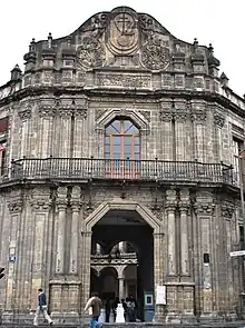 The Palace of the Inquisition stands on the corner of República de Brasil and República de Venezuela streets in Mexico City, Mexico. As neither side of the building faces Santo Domingo Plaza, the entrance is placed at a canted corner to face the plaza. Its long association with the Inquisition, which ended during the Mexican War of Independence, made it difficult to convert to other purposes.[1] However, it eventually became the School of Medicine for the reconstructed National University (now the National Autonomous University of Mexico (UNAM)). When UNAM moved to the Ciudad Universitaria in the 1950s, it retained ownership of this building, eventually converting the structure in what is today the Museum of Mexican Medicine.[2]
