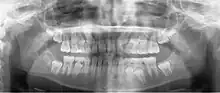 A dental panoramic radiograph, showing the maxilla and mandible, all the teeth including the "wisdom teeth," the frontal and maxillary sinuses, the nasal cavity and the temporomandibular joint and other near by head and neck anatomy.