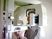Dental panoramic radiography equipment consists of a horizontal rotating arm which holds an X-ray source and a moving film mechanism (carrying a film) arranged at opposed extremities. The patient's skull sits between the X-ray generator and the film. The X-ray source is rectangular collimated beam.[1] Also the height of that beam covers the mandibles and the maxilla regions. The arm moves and its movement may be described as a rotation around an instant center which shifts on a dedicated trajectory.