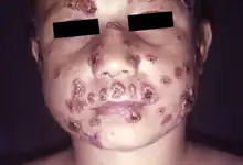 It can occur as a mouth and skin type, lymphangitic type, multi-organ involvement type (particularly lungs), or mixed type.[1][6] If there are mouth ulcers or skin lesions, the disease is likely to be widespread.[1] There may be no symptoms, or it may present with fever, sepsis, weight loss, large glands, or a large liver and spleen.[4][7]