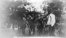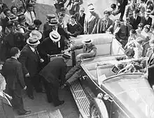 Roosevelt took great care to convince even close confidants that he was getting better, which he believed was essential if he was to run for public office again. To Richard E. Byrd, he wrote "By next autumn I will be ready to chase the nimble moose with you." To General Leonard Wood: his leg muscles "were all coming back".[12] His public appearances were carefully choreographed to avoid the press covering his arrival and departure, which would have shown him getting into or out of a vehicle or train. In private he used a wheelchair, but was careful not to be seen using it in public, although he sometimes appeared on crutches. He usually appeared in public standing upright, supported on one side by an aide or one of his sons. For major speaking occasions, an especially solid lectern was placed on the stage so that he could support himself on it; as a result, in films of his speeches, Roosevelt can be observed using his head to make gestures because his hands were gripping the lectern.[4]: 88–105
