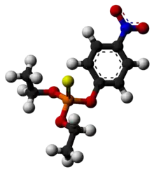 Parathion, also called parathion-ethyl or diethyl parathion, is an organophosphate insecticide and acaricide. It was originally developed by IG Farben in the 1940s. It is highly toxic to non-target organisms, including humans, so its use has been banned or restricted in most countries. In response to safety concerns, the less toxic but still dangerous analogue parathion methyl was later developed.[5]