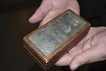 In 1694, the Parliament of England passed a resolution banning smoking in the House of Commons chamber and in committee rooms.[3] Following this, members still wished to take tobacco so snuff was used as a tolerated alternative to smoking as attributed to Erskine May: Parliamentary Practice.[4] In 1941, the House of Commons chamber was destroyed by a German bomb on the Palace of Westminster. The current parliamentary snuff box was created using timber from the destroyed chamber's door frame with a silver plate listing all the names of the Principal Doorkeepers since 1943 screwed onto the lid.[5][1][6] The responsibility for maintaining the parliamentary snuff box lies with the Principal Doorkeeper who stocks the box with snuff paid for with his own money.[1]