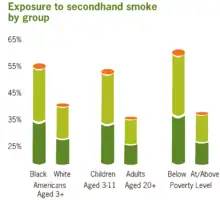 The US Centers for Disease Control and Prevention monitors the extent of and trends in exposure to environmental tobacco smoke by measuring serum cotinine in national health surveys.[116] The prevalence of secondhand smoke exposure among U.S. nonsmokers declined from 87.5% in 1988 to 25.2% in 2014. However, nearly half of blacks and the poor were exposed in 2014.