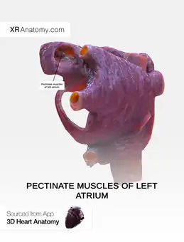 In the left atrium, the pectinate muscles are confined to the inner surface of its atrial appendage.[1] They tend to be fewer and smaller than in the right atrium. This is due to the embryological origin of the auricles, which are the true atria. Some sources cite that the pectinate muscles are useful in increasing the power of contraction without increasing heart mass substantially.