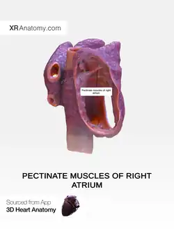 Behind the crest (crista terminalis) of the right atrium the internal surface is smooth.[1] Pectinate muscles make up the part of the wall in front of this, the right atrial appendage.