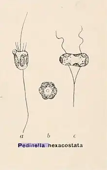 Pedinella is a genus of small, unicellular planktonic or attached, flagellated heterokonts first described in 1888 by A. V. Vysotskij.[1] The genus is monospecific, and the single species is Pedinella hexacostata Vysotskij.[1] Pedinella has an inverted bell or apple shape with a stalk arising from the posterior end, and has a single, long, ribbon-like, apical flagellum and, a second apical flagellum that is reduced to its basal body.[1][2] The cells are radially symmetrical, with a large central nucleus, surrounded equatorially by a number of chloroplasts that cause the body to bulge out where the plastids are pushed up against the plasma membrane.[1][2] The organism is found in freshwater and brackish freshwater habitats. Pedinella is a mixotroph and functions through either photosynthesis or by ingesting organic substances from its environment.
