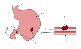 - ↑ Søgaard KK, Farkas DK, Pedersen L, Lund JL, Thomsen RW, Sørensen HT (2016). "Long-term risk of gastrointestinal cancers in persons with gastric or duodenal ulcers". Cancer Medicine. 5 (6): 1341–1351. doi:10.1002/cam4.680. PMC 4924392. PMID 26923747.