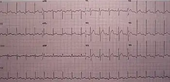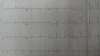 | An ECG showing pericarditis, with ST elevation in multiple leads and slight reciprocal ST depression in aVR. | |