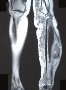 | MRI (coronal plane) showing the site of MPNST in the left tibia. | |