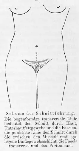 The surgeon cuts on a generally horizontal (slightly curved) line just above the pubic symphysis. The skin and subcutaneous fat are lifted off the rectus muscle fascia, going towards the head. This allows access to the lower midline of the anterior abdominal wall fascia. The fascia was cut vertically to separate the rectus muscles and enter the abdomen. Though the skin is incised transversely, the fascia was initially made in the midline but the modern technique involves transection of the fascia laterally.