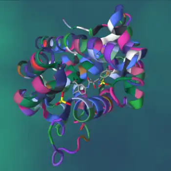 - ↑ Mast N, Zheng W, Stout CD, Pikuleva IA (February 2013). "Binding of a cyano- and fluoro-containing drug bicalutamide to cytochrome P450 46A1: unusual features and spectral response". The Journal of Biological Chemistry. 288 (7): 4613–4624. doi:10.1074/jbc.M112.438754. PMC 3576067. PMID 23288837.