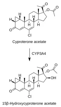 - ↑ Bhargava AS, Seeger A, Günzel P (1977). "Isolation and identification of 15-beta-hydroxy cyproterone acetate as a new metabolite of cyproterone acetate in dog, monkey and man". Steroids. 30 (3): 407–18. doi:10.1016/0039-128x(77)90031-9. PMID 413211. S2CID 54373018.