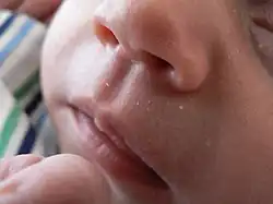 The philtrum (Latin: philtrum from Ancient Greek φίλτρον phíltron, lit. "love charm"[2]) or medial cleft is a vertical indentation in the middle area of the upper lip, common to therian mammals, extending in humans from the nasal septum to the tubercle of the upper lip. Together with a glandular rhinarium and slit-like nostrils, it is believed to constitute the primitive condition for at least therian mammals. Monotremes lack a philtrum, though this could be due to the specialised, beak-like jaws in living species.[3]