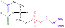 ![]() Components of phosphatidylserines: Blue, green: variable fatty acid groups Black: glycerol Red: phosphate Purple: serine | |