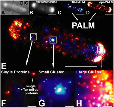 {{cite journal}}: CS1 maint: multiple names: authors list (link) - ↑ Shroff, H., C. G. Galbraith, J. A. Galbraith, and E. Betzig (2008). "Live-cell photoactivated localization microscopy of nanoscale adhesion dynamics". Nature Methods. 5 (44): 417–423. doi:10.1038/nmeth.1202. PMC 5225950. PMID 18408726.