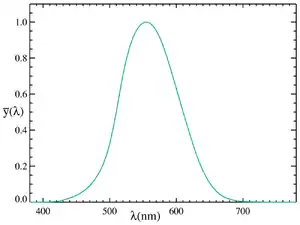 The human eye uses three types of cones to sense light in three bands of color. The biological pigments of the cones have maximum absorption values at wavelengths of about 420 nm (blue), 534 nm (bluish-green), and 564 nm (yellowish-green). Their sensitivity ranges overlap to provide vision throughout the visible spectrum. The maximum efficacy is 683 lm/W at a wavelength of 555 nm (green).[1] By definition, light at a frequency of 5.4×1014 hertz (λ = 555.17. . . nm) has a luminous efficacy of 683 lm/W.