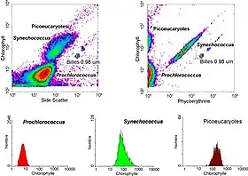 - Flow cytometry measures the size ("forward scatter") and fluorescence of 1,000 in 10,000 cells per second. It allows one to determine very easily the concentration of the various picoplankton populations on marine samples. Three groups of cells (Prochlorococcus, Synechococcus and picoeukaryotes) can be distinguished. For example Synechococcus is characterized by the double fluorescence of its pigments: orange for phycoerythrin and red for chlorophyll. Flow cytometry also allows researchers to sort out specific populations (for example Synechococcus) in order put them in culture, or to make more detailed analyses.